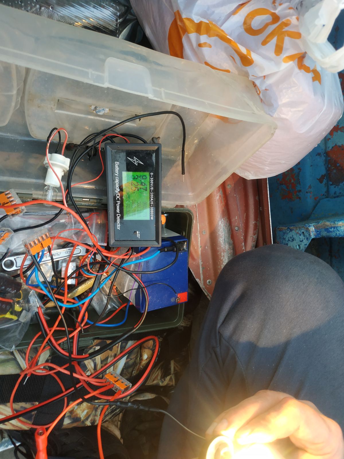 на малых оборотах (минимальная скорость троллинга) 21-22ватта(после регулятора напряжения , без просадки напряжения)4фото. При подключении на этих же оборотах 30ваттной лампы накаливания , напряжение проседает , 5фото .