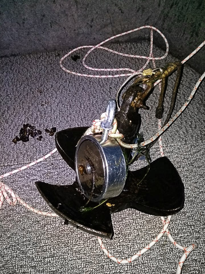 Заходим с другом на точку - видим в боковых лучах два предмета чем то похожие на якорь. Первый прям "горит" в боковом - ну явно метал. Но далековато от точки утопления. Второй предмет так себе, зато точно попадает в радиус поиска. Место - начало острова напротив выхода из Собаки. Поле травы и за ней небольшой пологий свал. Стали, давай швырять. Чешем край травы - 0. Лезем в траву - 0. Ползаем по свалу - 0. А кидать эту балду с лодки не очень удобно на самом деле. Кароче сделали забросов штук сто - болты. По ходу попробовали достать копию этого якоря (куплен на замену утопленнику). Поняли шо как должно быть - четкий легкий щелчок при контакте и подъем. Липнет и держит мертво. Пошли на первую точку. Нихрена. Набросались вдоволь - решили тролить