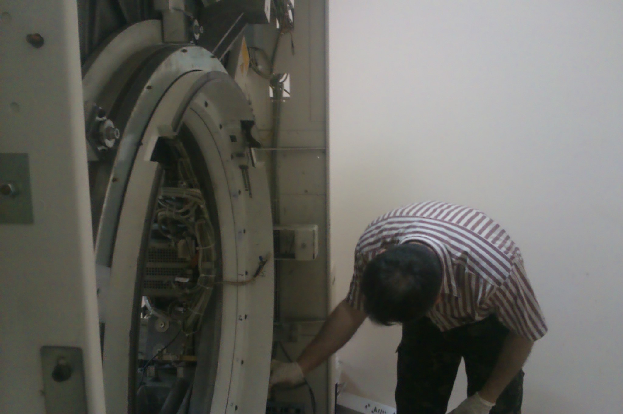 Включаем томограф, вращение гентри делаем, а эта махина так вибрирует и гремит, что одноэтажный домик, где он установлен, сотрясается очень серьезно. Разбираем половину томографа(это долго, муторно, но это совсем другая тема), добираемся к полуторометровому роликовому подшипнику, а внутри размятые шайбы... Походу, хозяин томографа , Борик, не расплатился с ребятами, которые раньше обслуживали томограф, и они ему "уронили" туда шайбы. Короче, собрали мы его, удалив шайбы, и смазку хадо туда напи...дячили. Включили на калибровку с медленным вращением, и пошли вниз к морю.... К вечеру, два тела, измученные "нарзаном" ( а точнее пивом был измучен я, а Шурик не пьет вообще) прищли назад. По звуку грохот и сотрясения фундамента здания заметно уменьшились. Так мы две недели туда шприцевали хадо, в итоге остался только подстукивающий звук. Борик остался доволен, счастливые лица туберкулезников расплылись в улыбке)