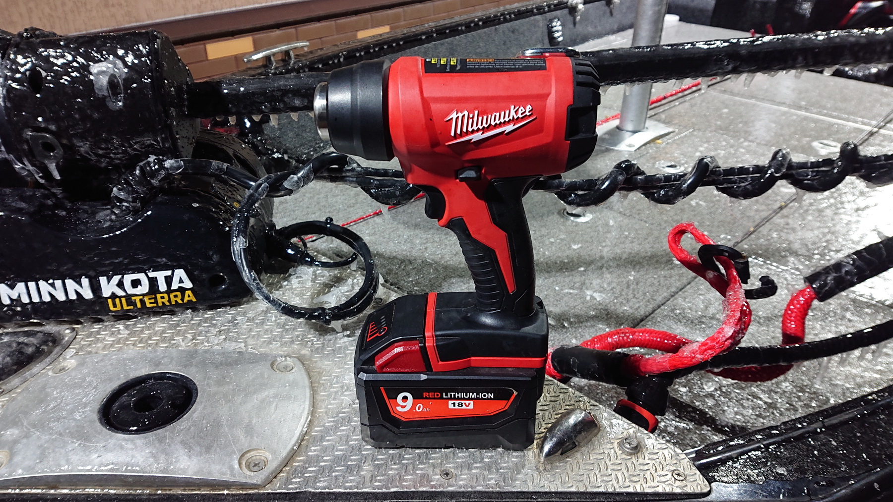 После обеда развернулся ветер на север, к вечеру раскачался наверно до 8 м/с. Уже после обеда минкоту забрызгало водой, пока в воде она норм работала до самого вечера, потом не смогла сложиться, так как примерзает пластина металлическая снизу. Фен аккумуляторый с собой уже вожу, чуть прогрел, сложилась минкота, пора домой. Пока был в черте города, ветер был не такой злобный, выскочил за мыс, а там уже срака полная, высокая и короткая волна. На глиссере сильно забрызгивает боковым и сразу обмерзает всё, скинул скорость, в лодку влетело 3 волны подряд и под ногами уже не слабо бегает воды. Тут косяк, сливные отверстия мелкие, их сразу забило шугой и вода не уходит. В общем слив буду переделывать. Дома лодка была как каток, рундуки не открыть, в общем фен это вещь