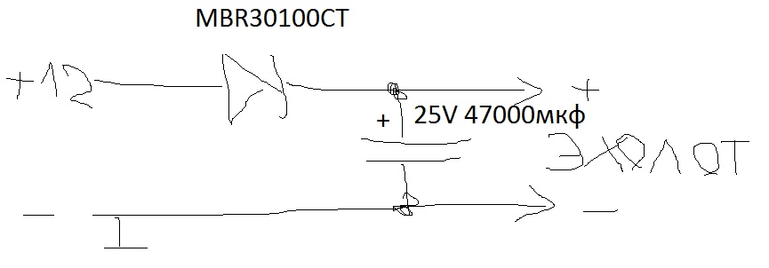 Принцип роботи простий, при просадці напруги в момент запуску ДВС, конденсатор підтримує на цей час 12В ехолоту, а діод не дає розрядитись конденсатору на стартер.