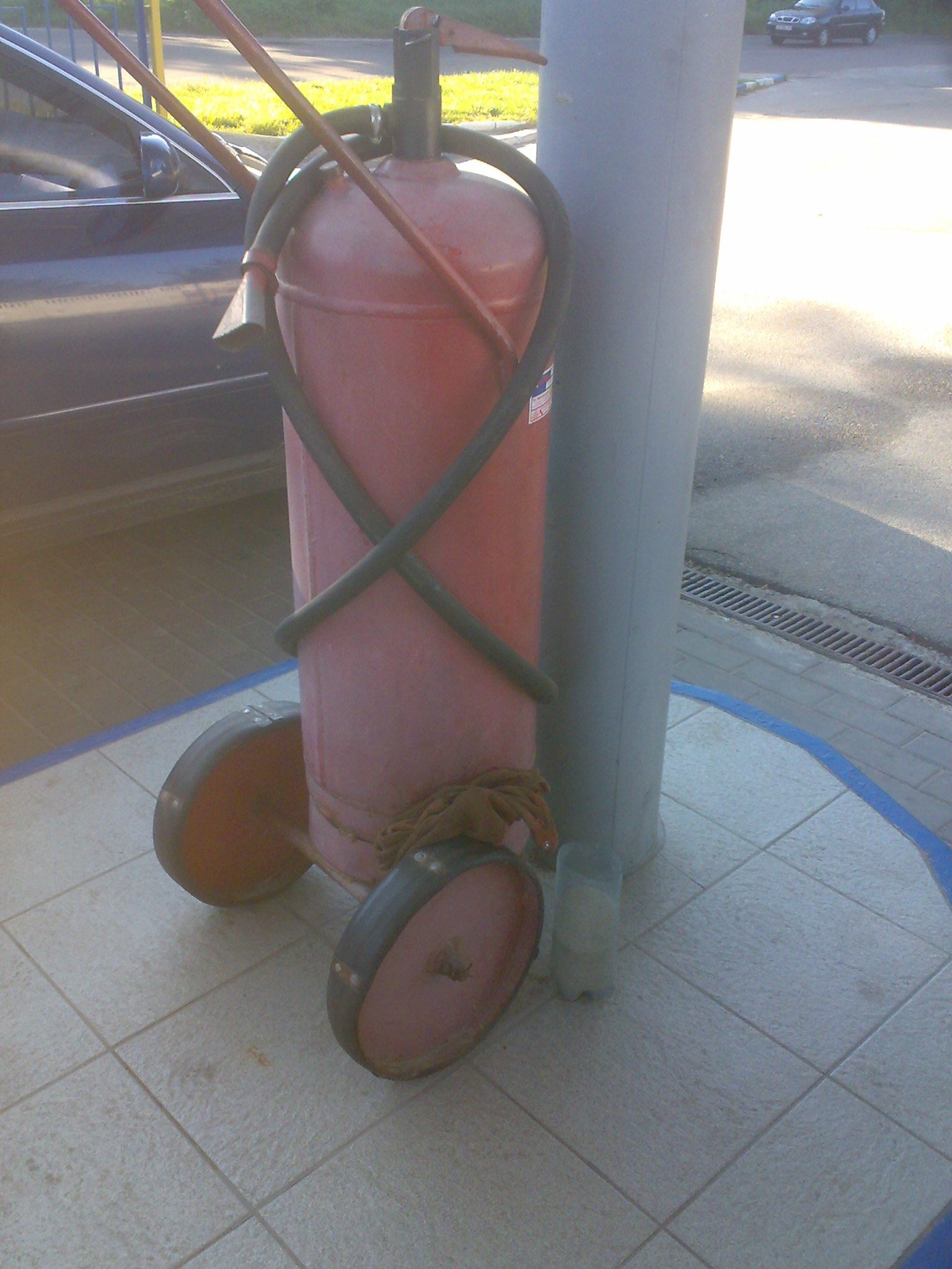 а раньше все было наоборот: ящик с песком и маленький огнетушитель ))))