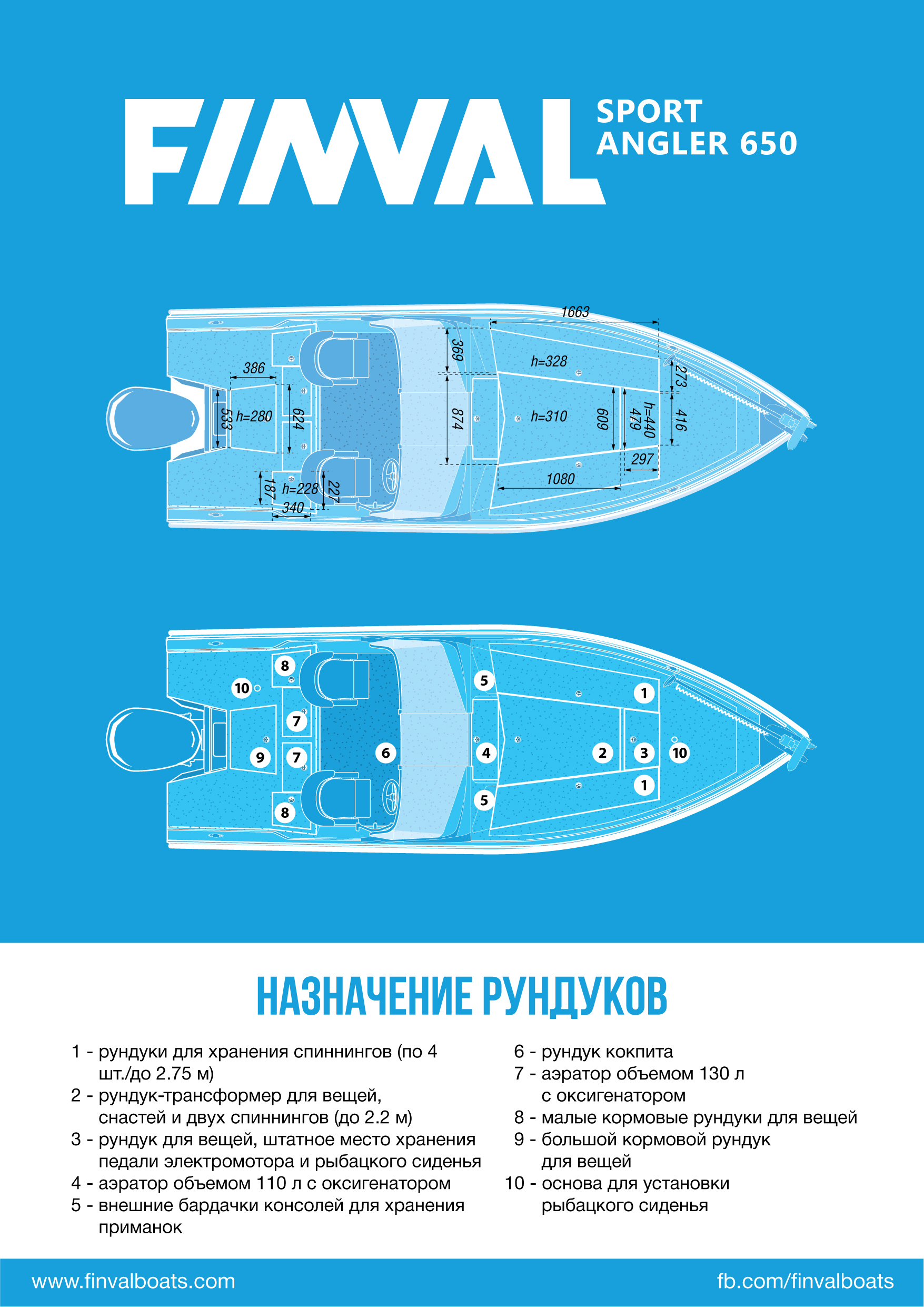 Еще немного информации по 650 Sport Angler. Размеры и расположение рундуков. Указана длина и ширина проемов. Внутри может быть больше.