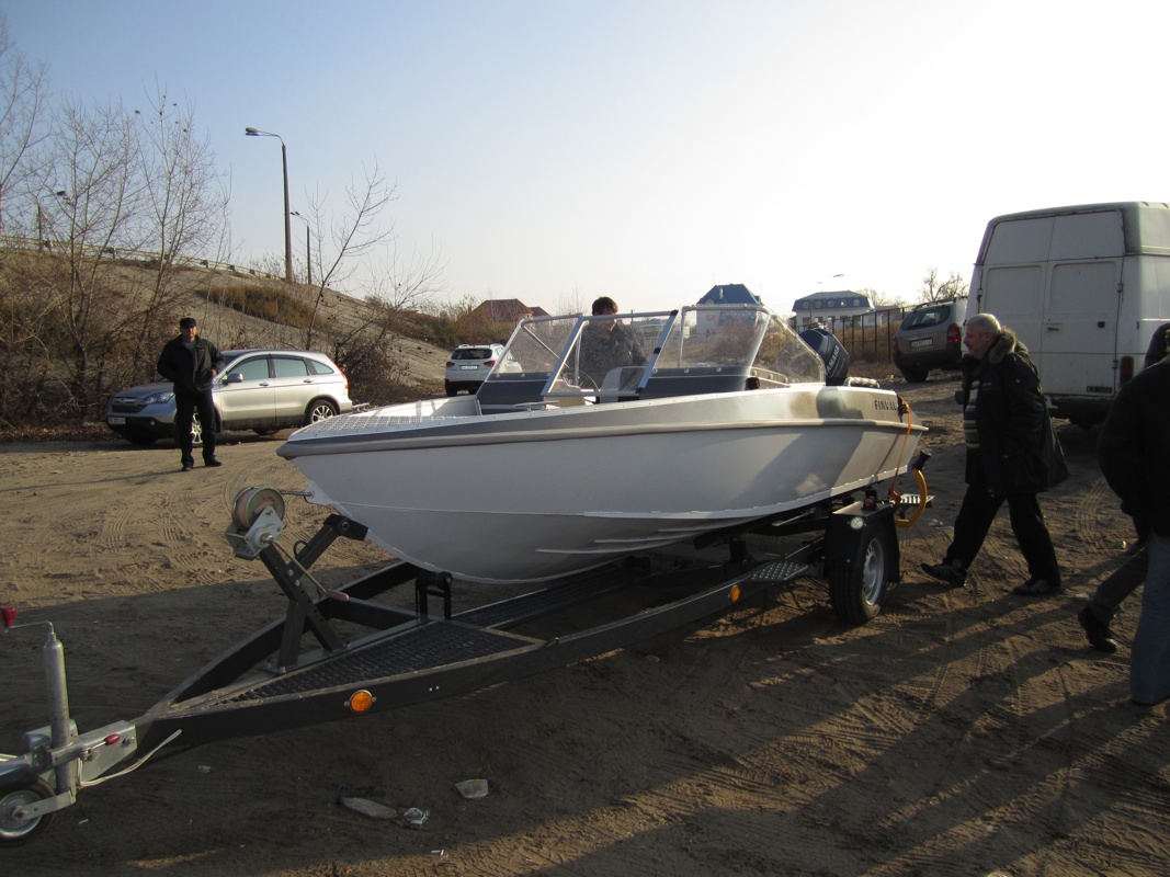 Впечетления о лодке. По волне идет мягко,(жалко волна была маловата) 60 сил хватает для комфортного перемещения по водоему, (на нее бы яму 70 поцепить и посмотреть что получится) управляемость шикарная, (когда Саша Dobermann начал закладывать разворот с полного хода было немного не по себе) волна а все таки боковая, а скорость под 60. Но лодка показала себя с лучшей стороны, ни намека на какую то нештатную ситуацию. При беготне по лодке сильной валкости тоже замечено не было. Были конечно мысли подбить на эксперимент еще пару человек да сесть втроем на один борт, но решил не рисковать, вода все таки холодная. Перекинутся то не должна, но купатся тоже не хотелось. А в общем вышел очень хороший рыбацкий комплект.