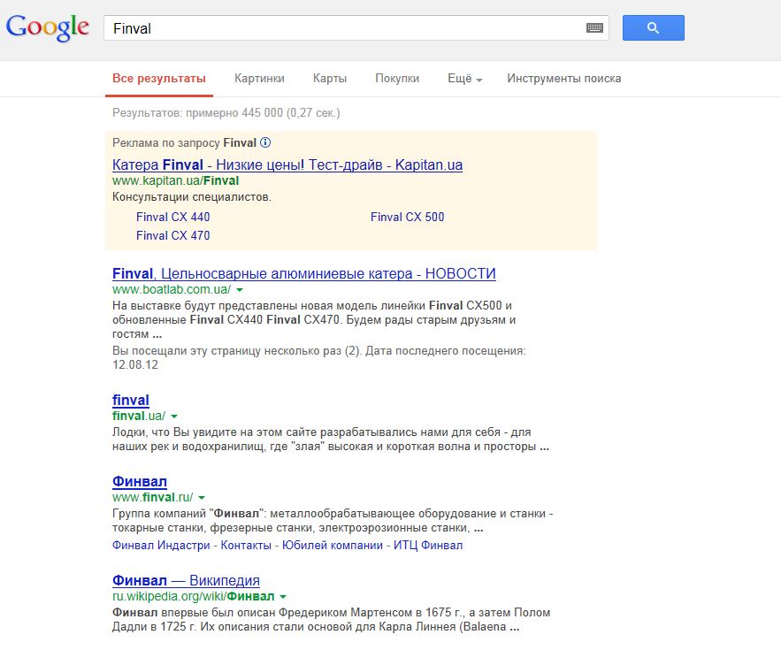 1. Забиваем в поиск московского Яндекса слова: Finval 500 Получаем результат: Яндекс 2. Как видно, первой строкой, в платной контекстной рекламе мы читаем: FINVAL - алюминиевые катера Официальный дилер в Москве. Доставка. Сервис. Тюнинг катеров. Адрес и телефон: prokatis.ru 3. То, что они являются представителями Финвалов в Росиии - ложь. Мы их не знаем, не видели и не общались ни разу. 4. Кликаем по рекламной ссылке и переходим на страничку от обманщиков: Spinningline SL470 - Алюминиевые катера Spinningline - Катера - Каталог товаров - PROKATIS.ru Внимательно почитайте текст. 5. Теперь переходим собственно на сайт производителя: Алюминиевые лодки | Finval 470 И уже абсолютно невнимательно читаем текст статьи ). Должен сказать, что каждую букву в ней написал когда-то ваш покорный слуга. ________________________________ Думаю, что через прочитав эту тему, воришки несколько изменят свой подход к рекламной стратегии продвижения лодок, с мелкими изменениями скопированных с одной из наших моделей. Но, имхо, страна должна знать своих героев: "достойных" представителей "достойного" "производителя" лодок Спиннинглайн. Одни - достойно скопировали каждую линию 470-го Финика, сняли матрицы с наших консолей. И внеся несколько непросчитанных конструкторами изменений в лодку, называют ее своей. Своего сайта, посвященного лодкам они пока не имеют. Другие (вполне может быть, что первые и вторые - одно и то же) - воруют тексты с нашего сайта, и сознательно платят деньги за нечестную рекламу через интернет. В данном случае факты говорят о том, что и первые и вторые вас обманывают. Попытавшись обмануть один раз, они обманут Вас и во второй раз и в третий. У нас, как у производителей есть только один способ эффективно бороться с подобным "маде ин чина": постоянно улучшать свой продукт. Так, что происходящее, в принципе, всегда было и будет на руку потребителю. А пока... Принимайте, мужики, воров - новых участников рынка ))): "Ведь однозначно, лодки Спиннинглайн всегда были и будут лучше и дешевле тех, с кого они содраны )." Правильно я цитирую слова, которые вы вешаете на уши людям, что звонят по вашей-же рекламе Финвалов, воришки из "прокатись.ру"? А ведь люди эти ищут совсем не карандаши, а что-то подобное своей мечте. |